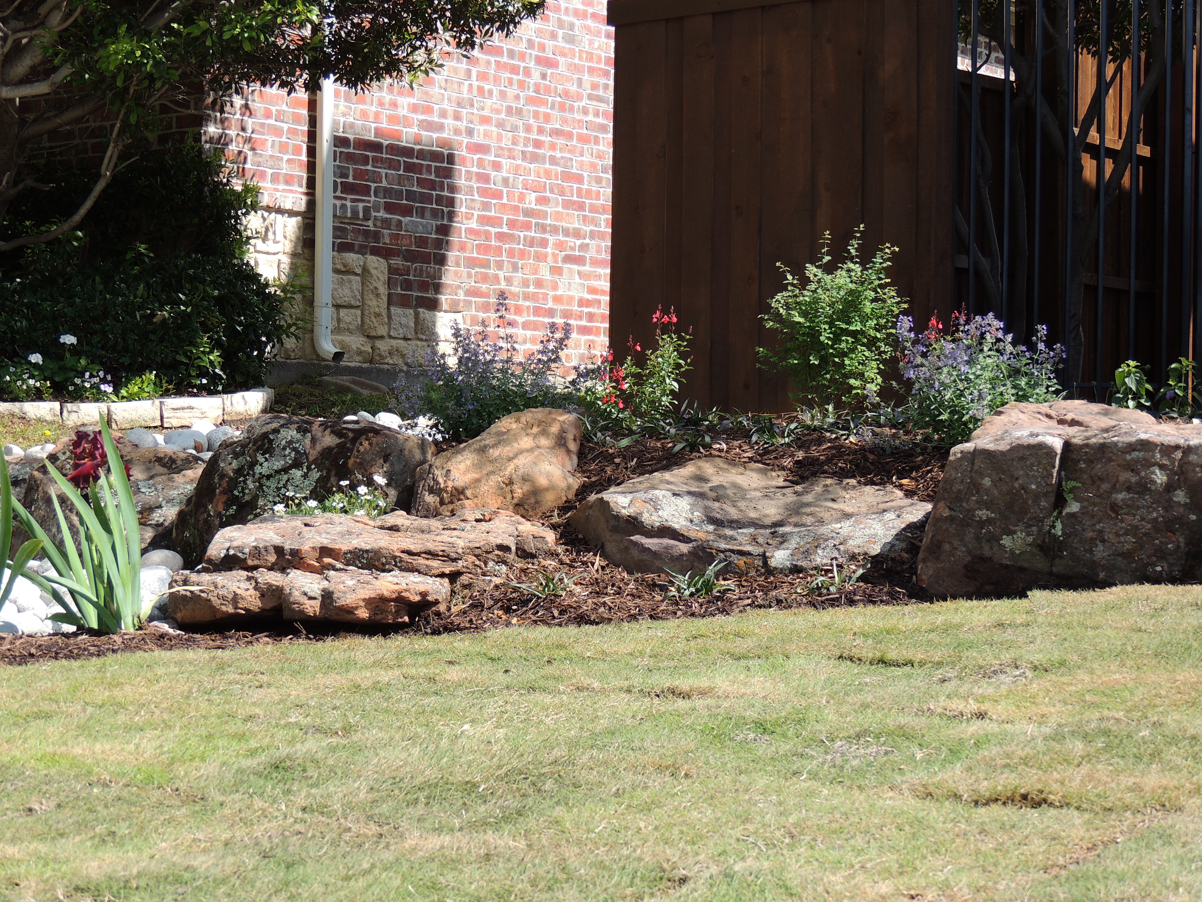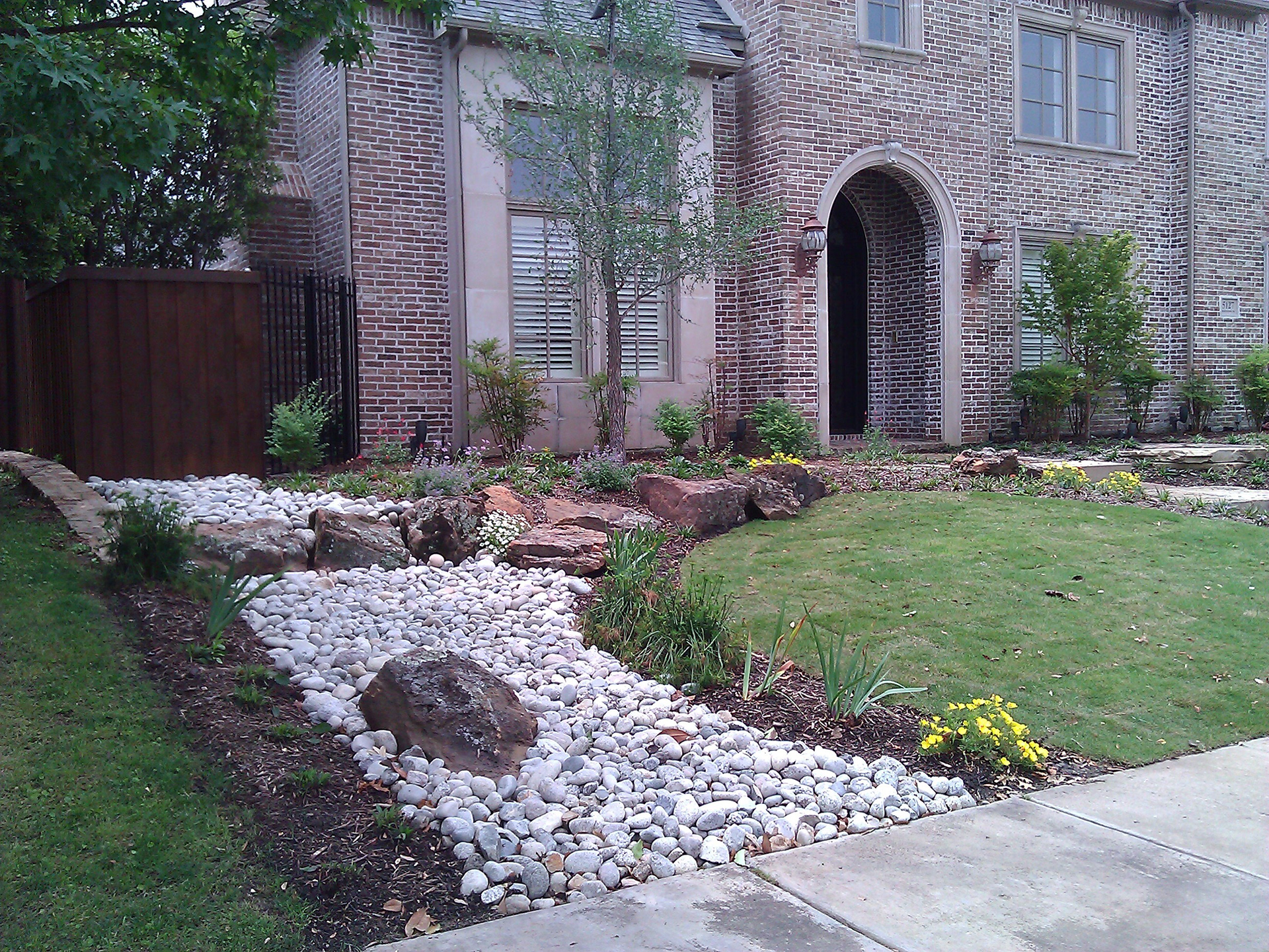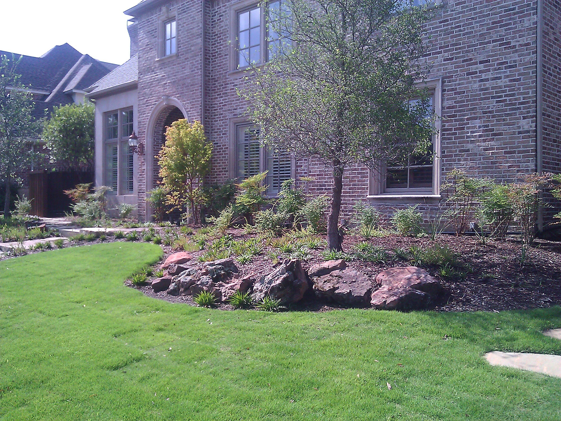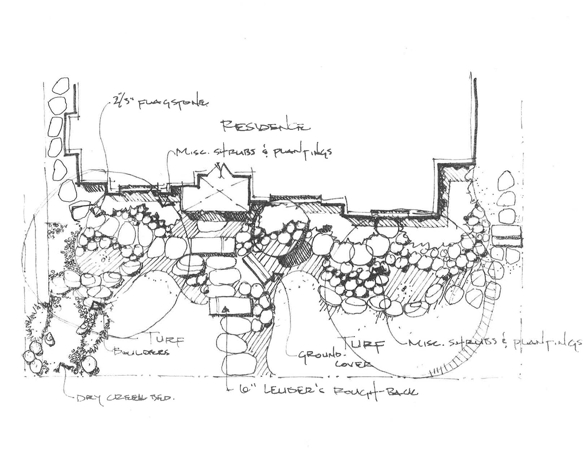 Objective: create a naturalisitc solution for a moderately sloped site. A low maintenance plant selection with complementing course and fine textures, and mixture of perennials and evergreens catering to a desire for year-round enjoyment and minimal work. Integrate a dry creek bed to mitigate effects of low head drainage from neighboring property at higher elevation.