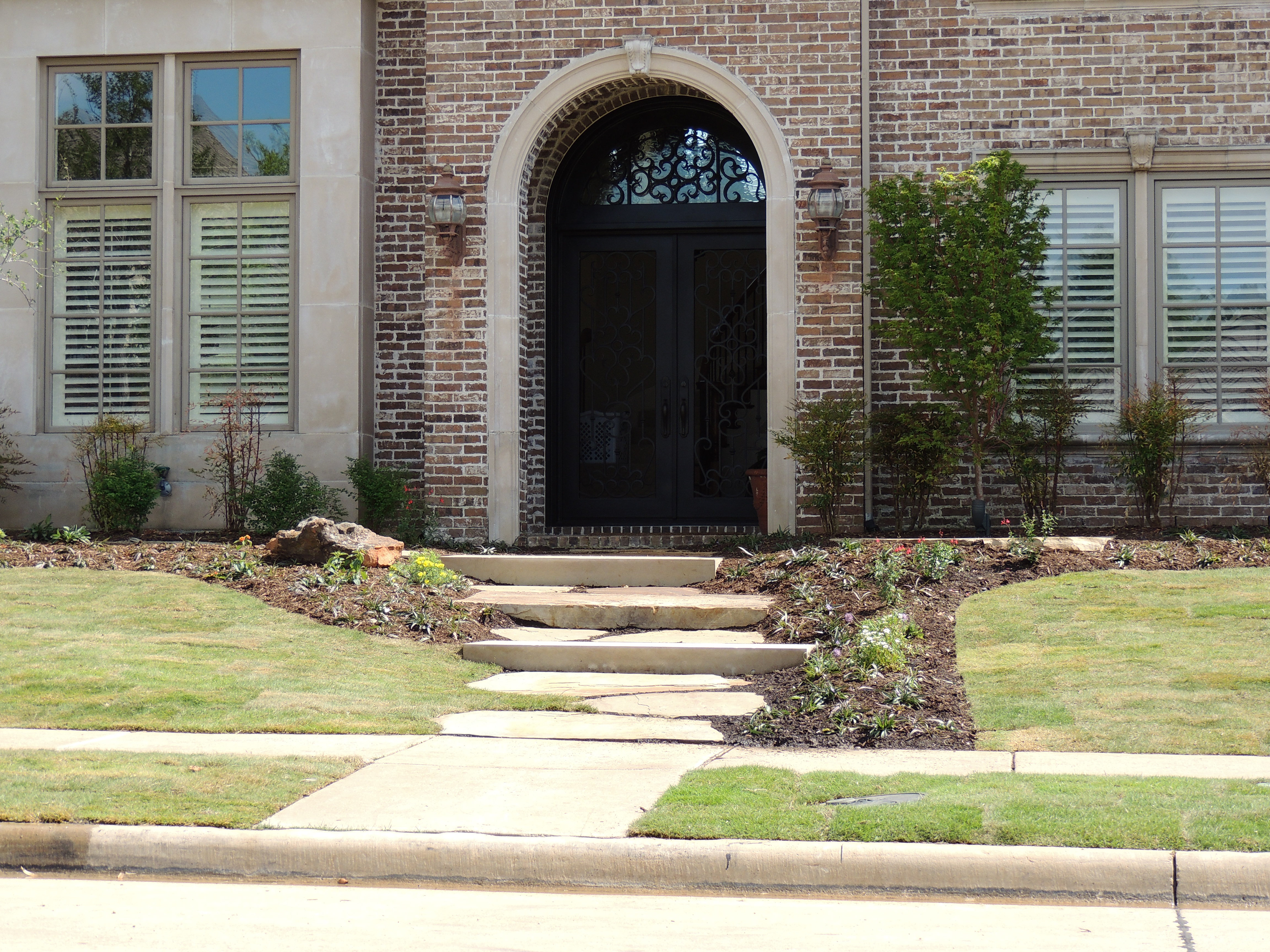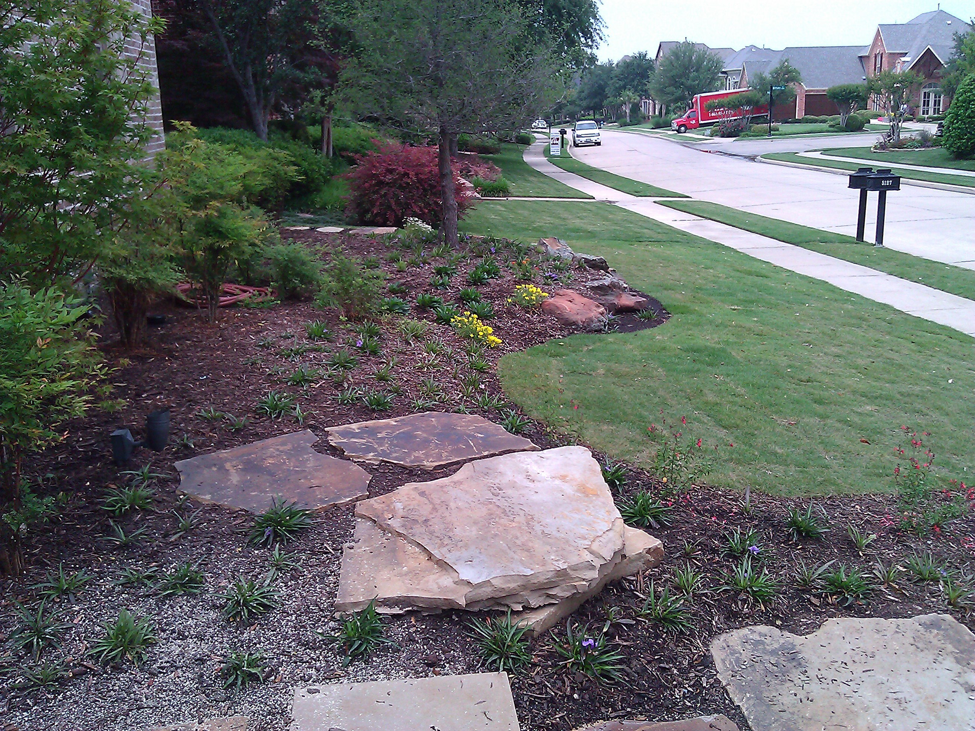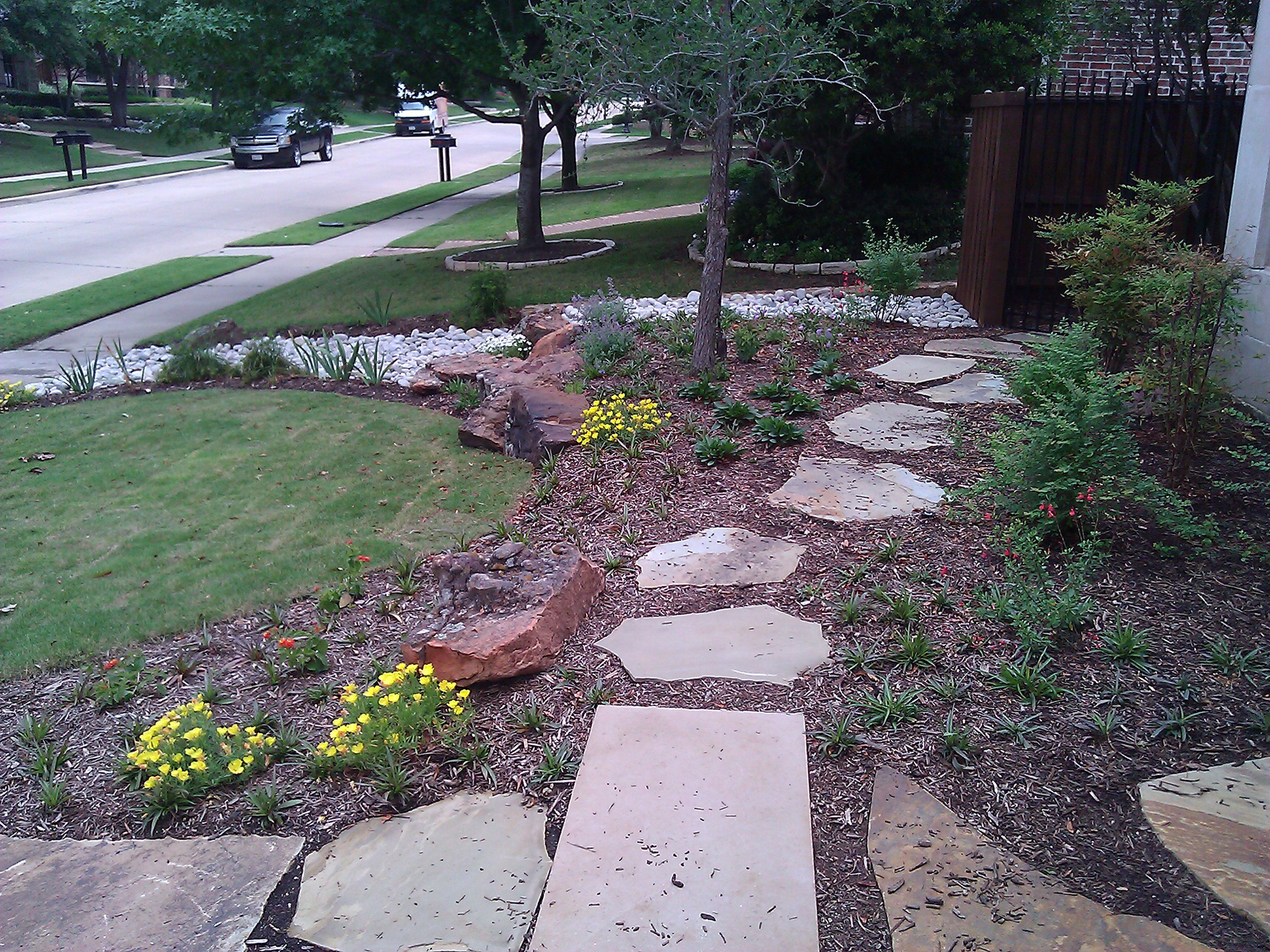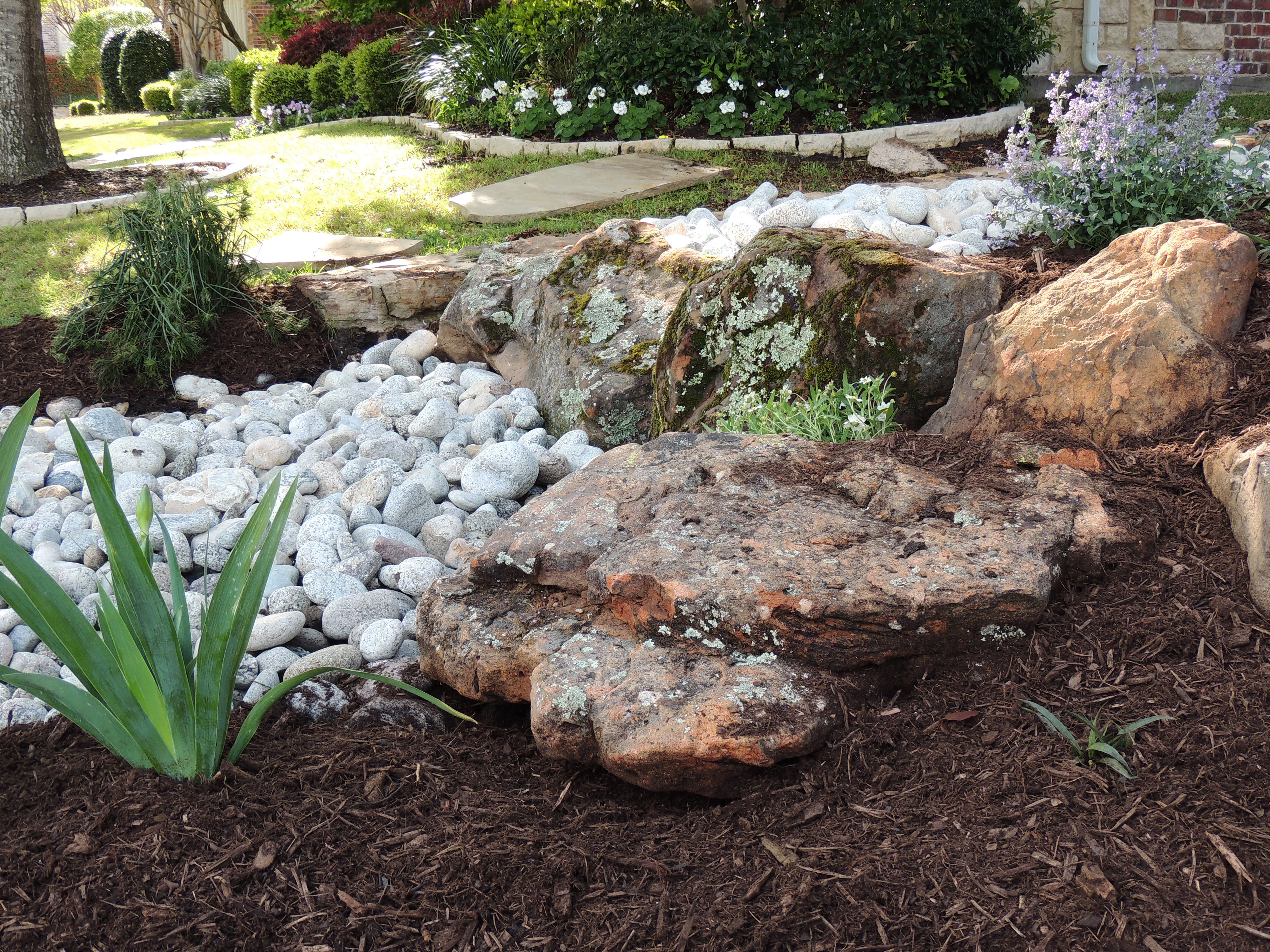 Objective: create a naturalisitc solution for a moderately sloped site. A low maintenance plant selection with complementing course and fine textures, and mixture of perennials and evergreens catering to a desire for year-round enjoyment and minimal work. Integrate a dry creek bed to mitigate effects of low head drainage from neighboring property at higher elevation.
