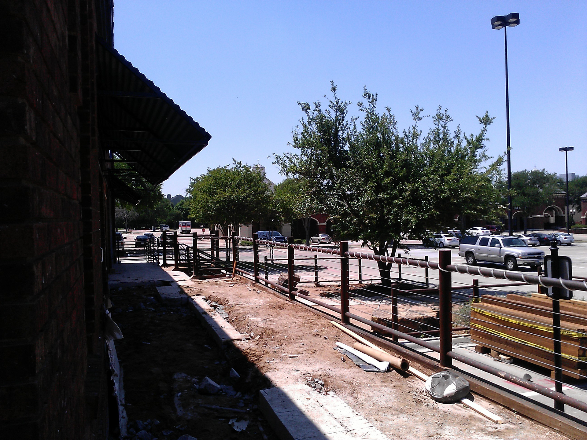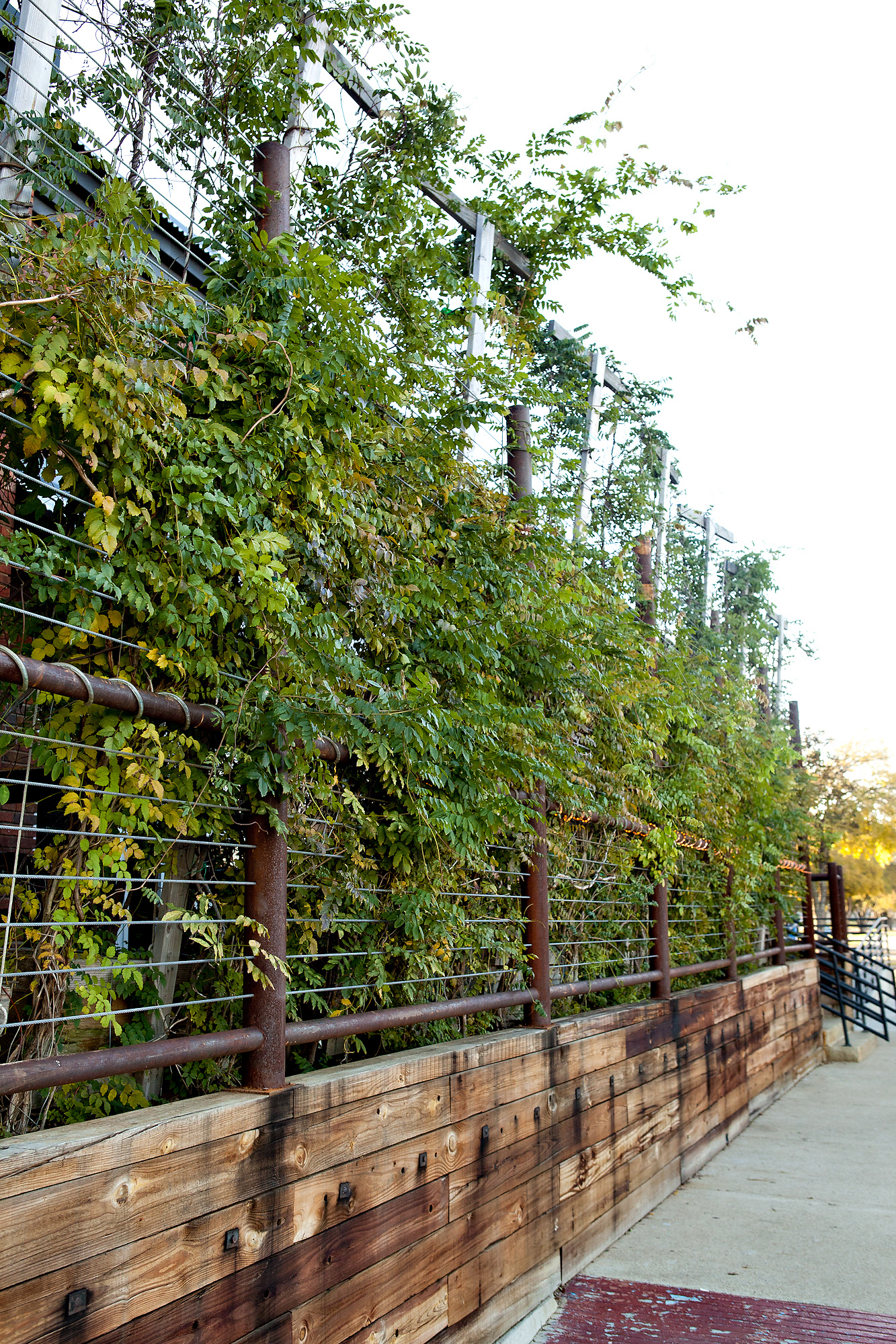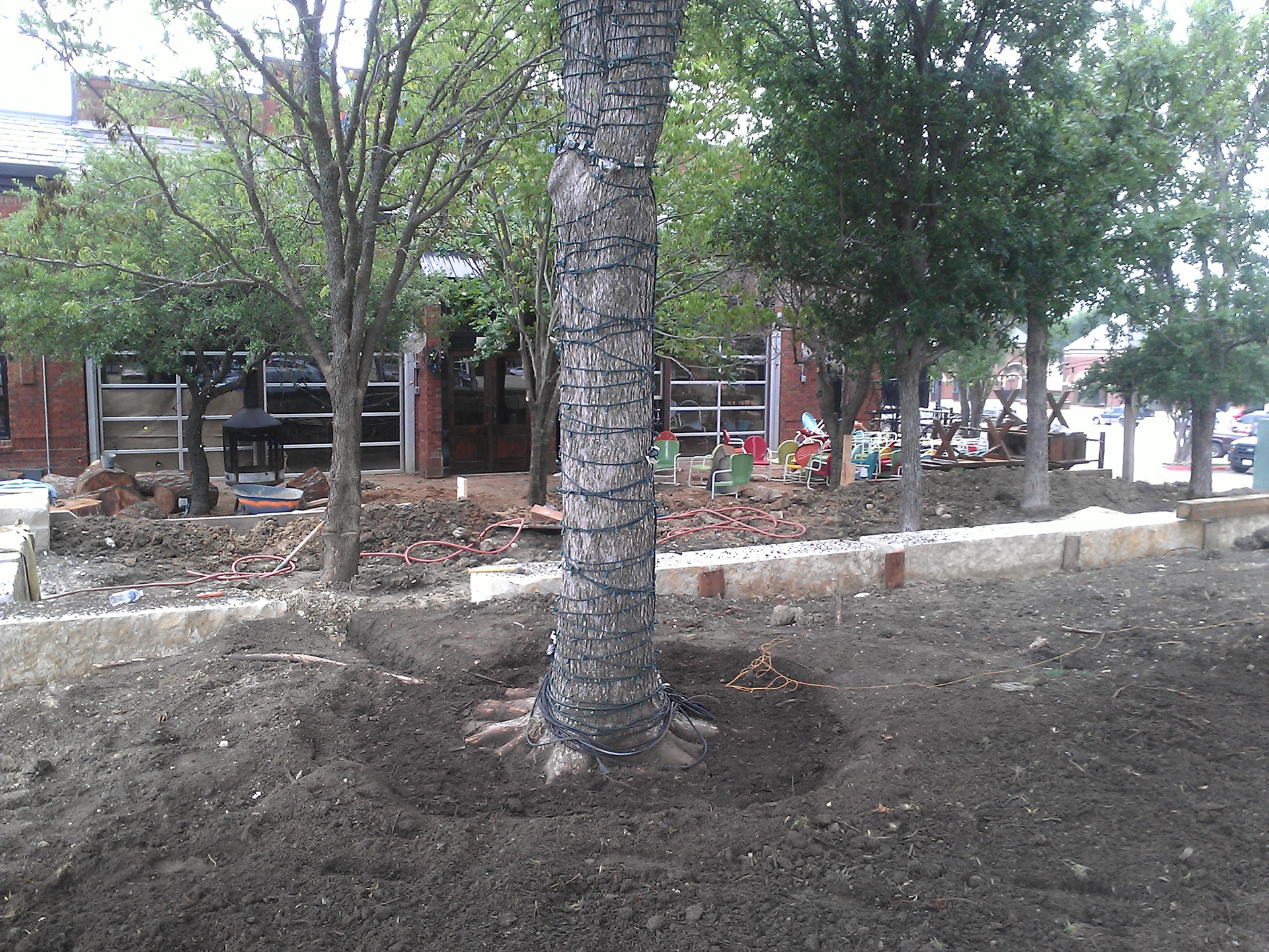 Objective: Design and install a full green screen in a three week timeframe for an outdoor restaurant patio that best mirrors an established wooded area. Spec’ mature plant material to take full advantage of their size in providing a complete screen from the surrounding parking lots and major thoroughfares, all-the-while working around many other contractors aiming to finish before opening day.