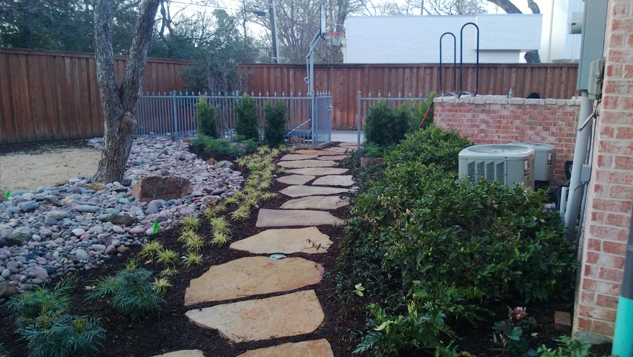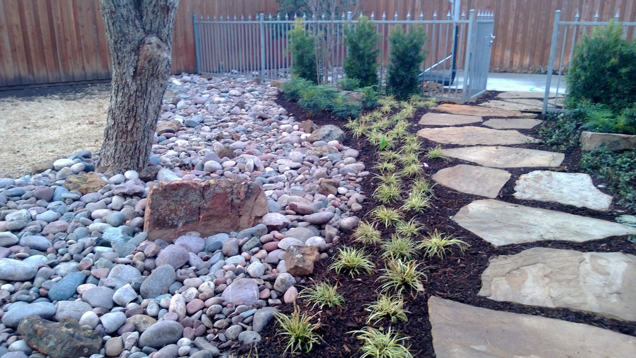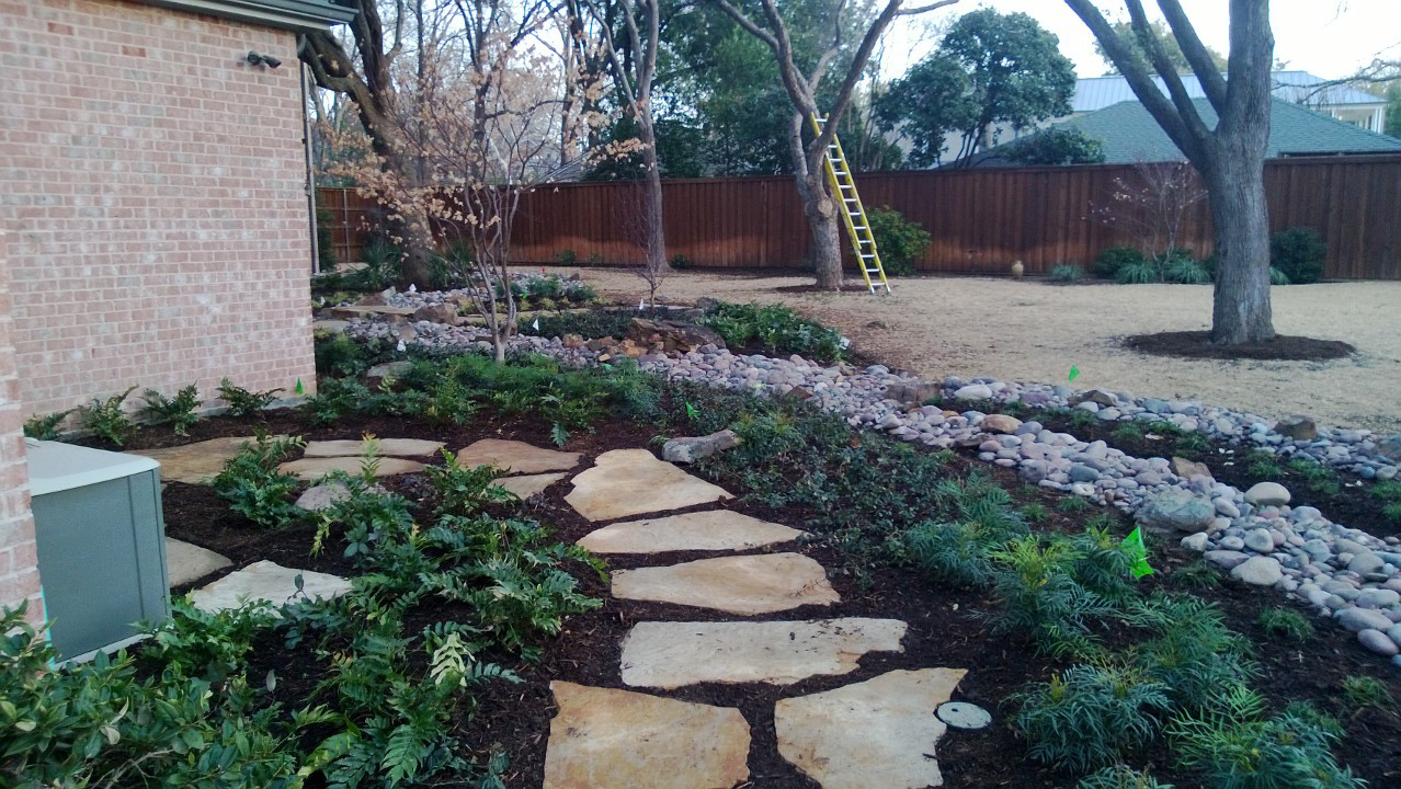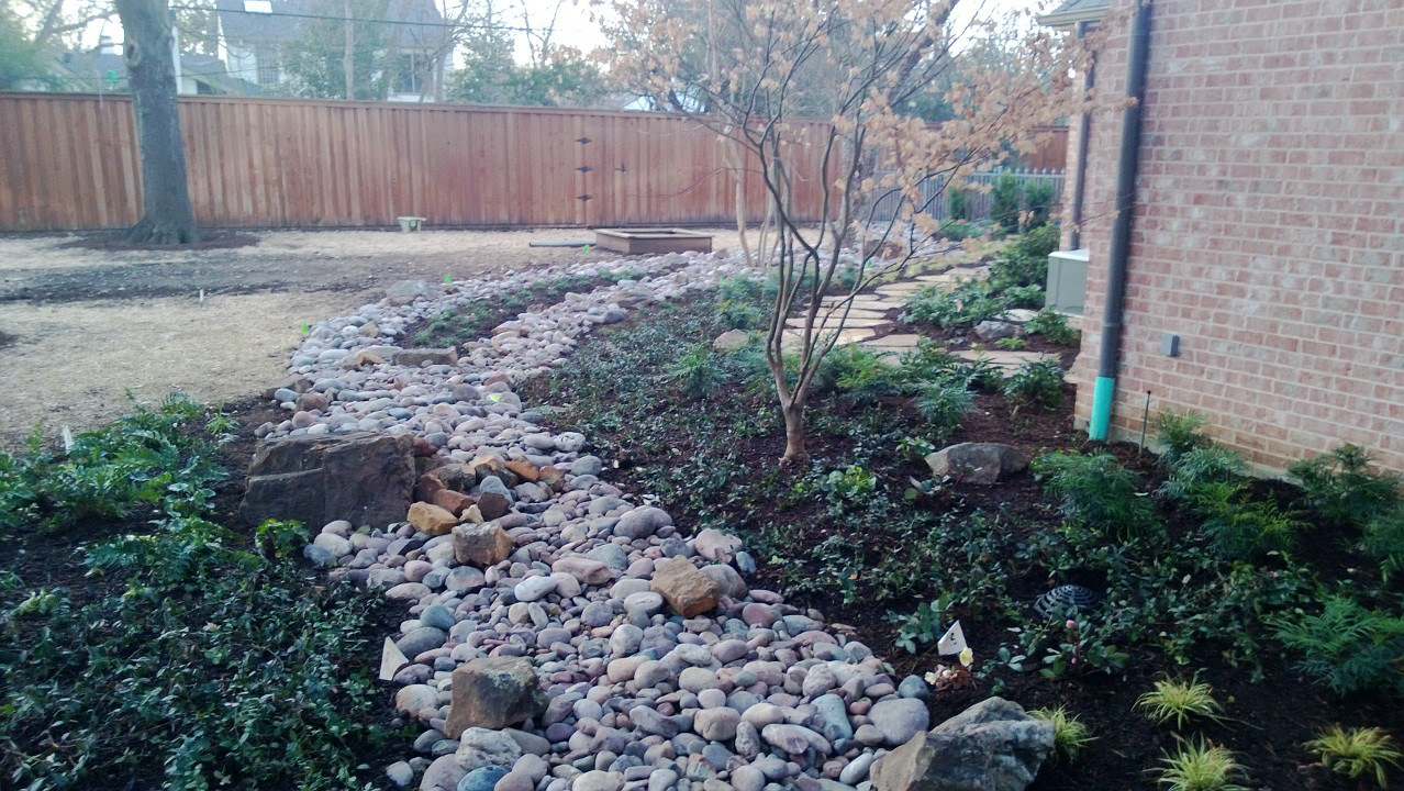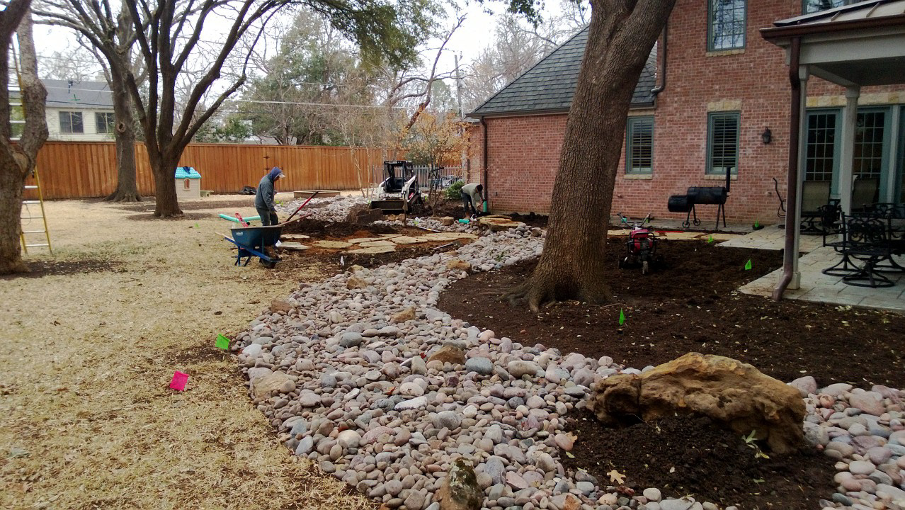 We provided a low maintenance landscape in accordance with the client’s wishes. The dry creek bed takes advantage of the existing drainage to funnel surface and roof runoff into underground drainage and off site. We also needed to be cognizant of root zones within which we had to work, so proper equipment was utilized to mitigate compaction.